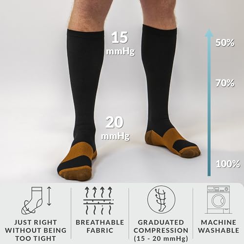Why choose copper compression? Copper is known for its healing properties, which, combined with graduated compression, can help improve blood flow and reduce swelling. This is particularly beneficial for those who spend long hours sitting at a desk, standing on their feet, or travelling. The socks provide targeted pressure that helps prevent serious conditions like Deep Vein Thrombosis (DVT), while also alleviating the discomfort associated with varicose veins.