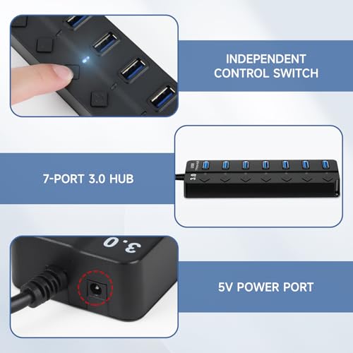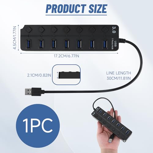 7-Port USB 3.0 Hub with Individual Switches & Lights, Multiple Port USB Adapter Extension High-Speed Data Hub, Portable USB Splitter with 1FT Extended Cable for PC, Laptop, Printer and More