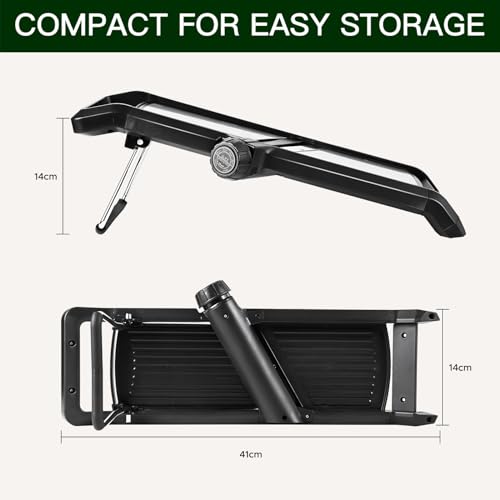 - Elevate your culinary experience with the Harcas Adjustable Mandoline Vegetable Slicer—your new kitchen companion that can cut food preparation time by an impressive 50%. Imagine effortlessly transforming fruits, vegetables, and potatoes into beautifully uniform slices or julienne cuts, allowing you to focus on enjoying your meals rather than labouring in the kitchen. With adjustable thickness settings ranging from 1mm to 9mm for slices and 4.5mm to 9mm for julienne cuts, this versatile tool is perfect for crafting everything from crispy French fries to delightful vegetable chips and refreshing coleslaw. Safety and convenience are at the forefront of this mandoline slicer’s design. Featuring a hand safety guard and protective blade sleeve, along with non-slip rubber feet, it ensures secure operation every time. Clean-up is a breeze—simply rinse under running water or pop it in the dishwasher. Crafted from robust stainless steel, this slicer is built to withstand heavy-duty use, outlasting flimsy plastic alternatives. Buy with confidence from a UK-based seller, as our product comes with a 365-day warranty and a 30-day money-back guarantee. Experience professional-quality slicing at home and discover why the Harcas Adjustable Mandoline Vegetable Slicer is a must-have for any kitchen enthusiast!