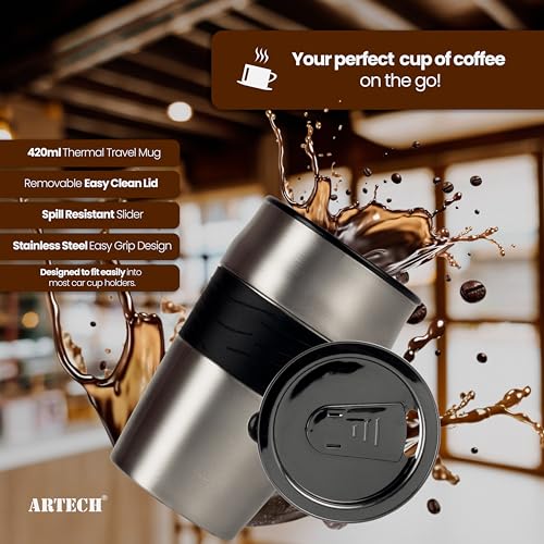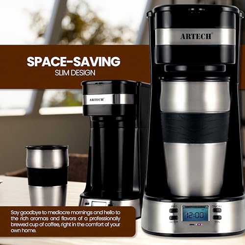- Introducing the ARTECH Personal Coffee Maker, your new best friend for brewing a perfect cup of coffee while on the move! Designed specifically for coffee enthusiasts who refuse to compromise on quality, this sleek and compact machine brews a single serving directly into the included 420 ml insulated stainless steel travel mug. No more worries about spills or lukewarm coffee—just place the mug under the drip, secure it with the user-friendly lid, and you’re all set!