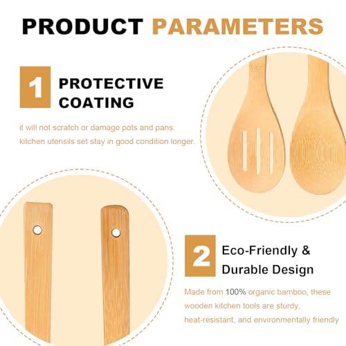 - What sets our utensils apart? They’re made from 100% organic bamboo, ensuring they are not only eco-friendly but also incredibly durable and resistant to heat. Unlike metal utensils that can scratch and damage your precious non-stick cookware, our wooden utensils provide a gentle touch, allowing you to extend the life of your pots and pans effortlessly.