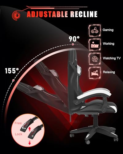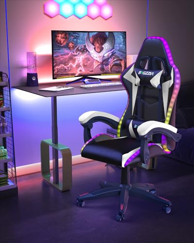 bigzzia RGB Gaming Chair with LED Lights and Ergonomic Computer Chair Reclining PU Leather High Back Video Game Chair with Headrest Adjustable Lumbar Support Linkage Armrest(Black/White)
