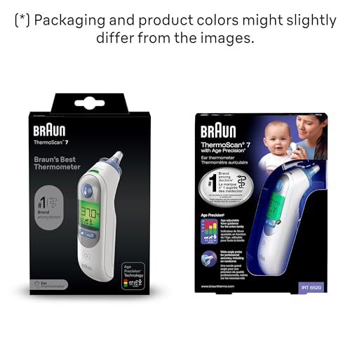 - Discover peace of mind with the Braun ThermoScan 7 Ear Thermometer, the #1 brand trusted by doctors for home health management. This clinically validated thermometer offers unparalleled accuracy, allowing you to monitor your family's health with confidence. Thanks to its innovative Age Precision Technology, the ThermoScan 7 adjusts the definition of fever based on your child's age - a crucial feature as the fever thresholds differ from newborns to toddlers. The colour-coded display makes it easy to interpret results at a glance: green signals no fever, yellow indicates a mild fever, and red warns of a high fever.