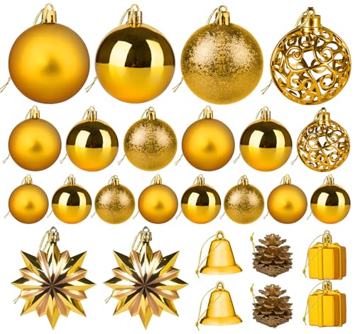 One of the standout features of this set is the variety of sizes, ranging from 3cm to 6cm. This ensures a dynamic look that captures attention and enhances the overall aesthetic of your tree. The pure gold colour not only radiates elegance but also complements a wide range of decor styles, making it a versatile choice for countless holiday settings.
