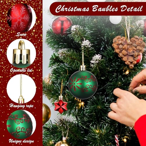 This set features a vibrant mix of large and small baubles in white, red, and green, each boasting unique finishes such as glossy, matte, and glittering textures. These eye-catching designs are perfect for creating a stunning visual impact, whether your tree is a traditional centerpiece or part of a more modern display.