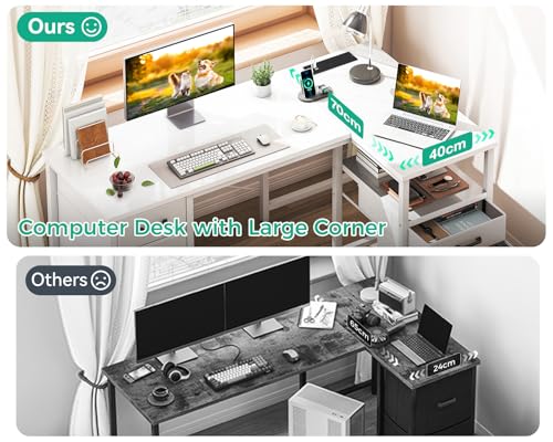 Coleshome 140cm Computer Corner Desk with 1 Filing Cabinet and 5 Fabric Drawers, L Shaped Office Desks with Power Outlet, White PC Table with Storage, Reversible Study Table for Bedroom