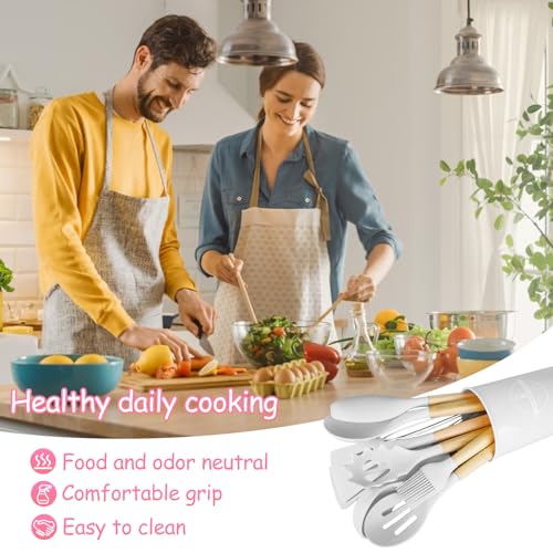 CTDMJ Kitchen Utensil Set 12 PCS Silicone Cooking Utensils Set with Wooden Handle Non-Stick Cooking Spoons Utensil Sets Silicone Kitchen Utensils Set Heat Resistant Kitchen Tools (White)