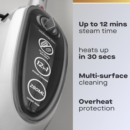 - Transform your cleaning routine with the Daewoo 12-in-1 Steam Mop, a powerful yet eco-friendly solution designed to tackle dirt, grime, and 99.9% of bacteria around your home. In just 30 seconds, this innovative steam mop heats up and delivers 12 minutes of high-performance cleaning, eliminating the need for harsh chemicals. Its upright design allows for deep cleaning of hard floors and carpets, while the triangular swivel head expertly navigates corners and tight spaces, ensuring no nook is left untouched.