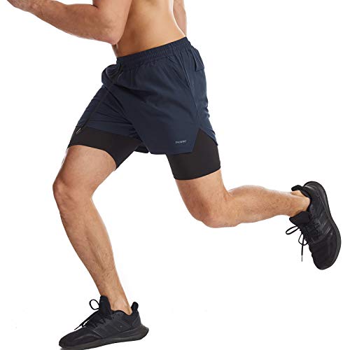 Danfiki Men Running Shorts Men's Shorts Workout with Phone Pocket 2 in 1 Gym Training Shorts Lightweight Quick Drying Navy Blue