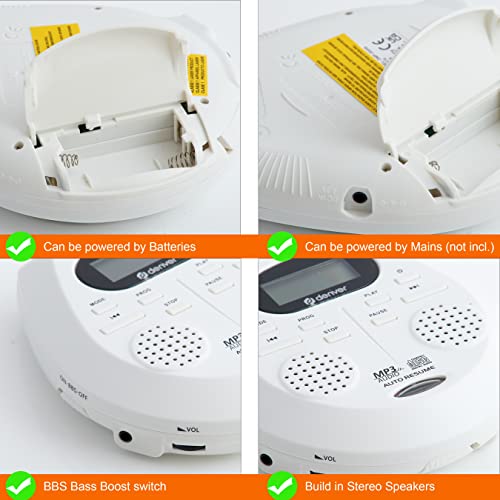 Denver Portable CD Player With Speakers/CD Walkman Discman/CDs, MP3 & Audio Book / 40 Second Antishock/Resume Play/Mini CD Player Portable with Bass Boost/For Car, Kids or Elderly - DMP-395