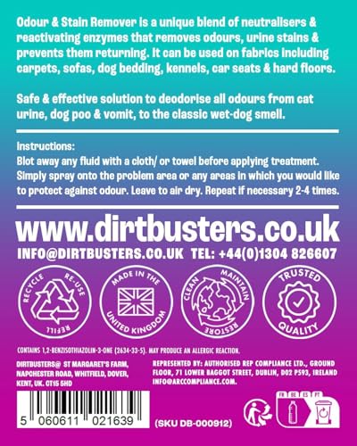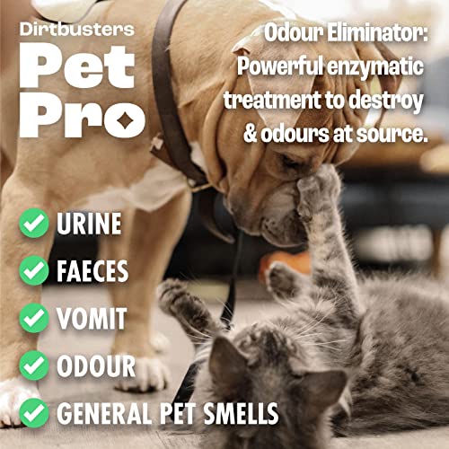 - Introducing the Dirtbusters Pet Pro Stain and Odour Eliminator Spray - your ultimate solution to tackling stubborn pet stains and unpleasant odours! This powerful enzyme cleaner is specifically designed to neutralise and eliminate pet urine, faeces, vomit, and other unwanted smells from a variety of surfaces, ensuring your home remains fresh and inviting.