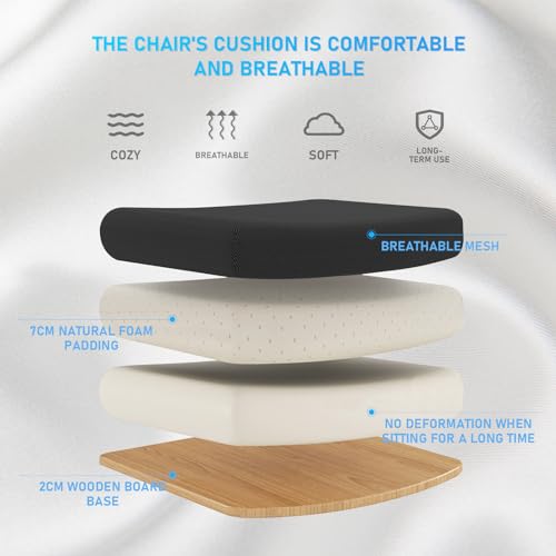 - The butterfly-shaped backrest not only supports your spine but also promotes optimal air circulation, keeping you cool and comfortable throughout your tasks. The chair’s seat cushion, measuring 50cm in length and 46cm in width, is generously padded with 7cm thick sponge material that retains its shape, offering you a soft yet supportive seating experience.