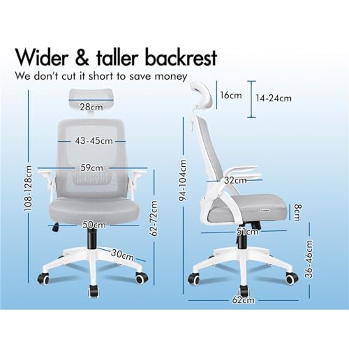 ELFORDSON Ergonomic Office Chair with Flip-up Armrest Footrest for Home Office, Computer Mesh Desk Chair with Headrest Lumbar Support Swivel Work Chairs, White and Grey