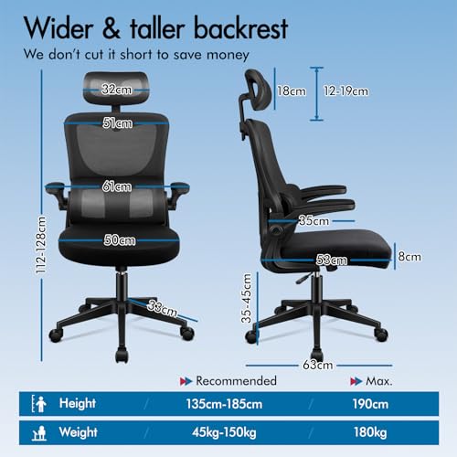 ELFORDSON Ergonomic Office Chair, High Back Computer Chair with Headrest/Dynamic Lumbar Support/Padded Flip-up Armrest, Breathable Mesh Swivel Desk Chairs for Home Office, 120° Rocking, Black