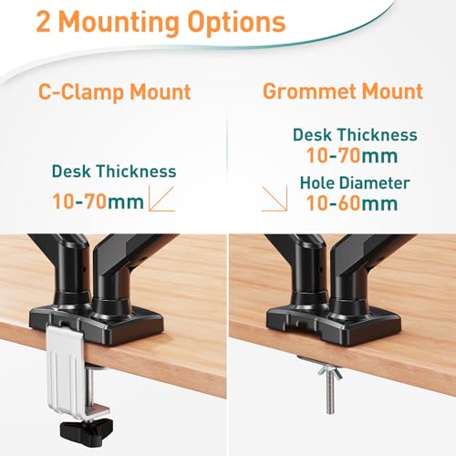 Installation is straightforward with two mounting options: a C-clamp for traditional desks or a grommet base for those with pre-drilled holes. This flexibility ensures that no matter your desk setup, the ELIVED Dual Monitor Arm can fit seamlessly into your environment.