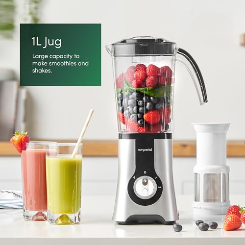 Emperial 4 in 1 Blender Multifunctional Smoothie Maker, Juicer, Grinder & Ice Crusher 220W | 1L Blending Jug, 500ml Smoothie Jug and Travel Mugs and 300ml Small Blending Jug with lids (Silver)