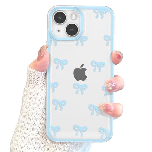 EYZUTAK Case for iPhone 14, Clear Cute Ribbon Bowknot Pattern Aesthetic Transparent Phone Case Raised Camera Protection Stylish Slim Soft Durable TPU Protective Cover for Women Girls - Blue