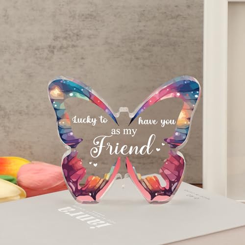 - Looking for the perfect gift to express your appreciation for a special friend? The Welsky Butterfly Acrylic Plaque is an exquisite choice that embodies gratitude, love, and friendship. With the heartfelt message, "Lucky to have you as my friend," this beautiful ornament makes a meaningful addition to any occasion, whether it's Christmas, Valentine's Day, a birthday, a wedding anniversary, or simply a thoughtful surprise. Crafted from high-quality acrylic, this plaque is expertly cut and polished into a stunning butterfly shape, ensuring it is free from impurities and scratches. Measuring 13.5 x 13.5 x 2.5 cm, it fits perfectly on a shelf, table, or nightstand, making it a versatile décor piece for any space, including the living room, kitchen, or office.