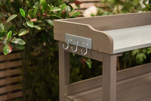 One of the standout features of this potting table is its galvanised steel worktop, which not only adds a modern touch but is also rust-resistant and incredibly easy to clean. Say goodbye to the frustrations of messy gardening tasks! With its two reinforced wooden shelves and six galvanised metal hooks, you will find ample space to store everything from pots to tools, keeping your gardening area well-organised and clutter-free.