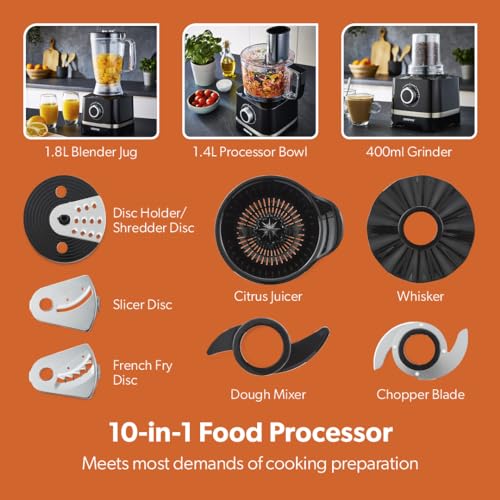 Its 800W motor provides powerful performance, allowing you to tackle a variety of tasks from mixing dough to grinding spices. The generous 1.8L blender jug is perfect for larger batches, whether you’re hosting a dinner party or simply prepping meals for the week ahead.