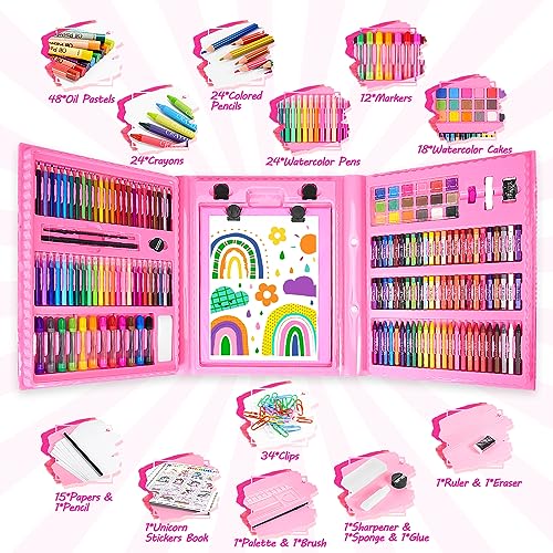 The set includes 208 items, such as oil pastels, crayons, watercolour pens, and even a unicorn sticker book, providing endless creative possibilities!