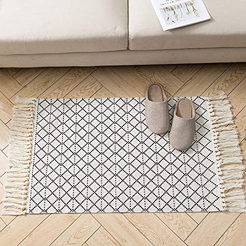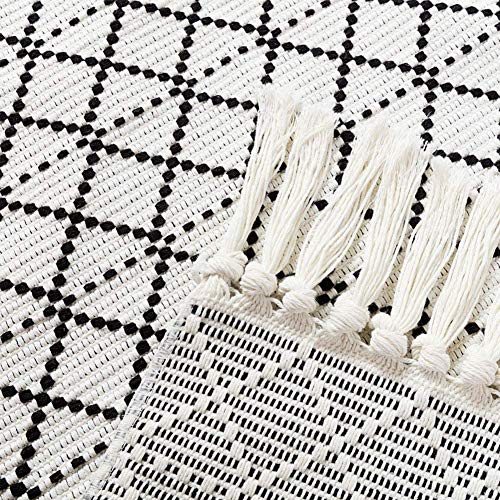 Are you looking to refresh your home décor? The hi-home Area Rug is the perfect solution! This stylish cotton small rug combines trendy design with practicality, making it an essential addition to any room in your home. With its eye-catching black geometric diamond pattern and classic tassels, it adds a bohemian flair that complements various interior styles.