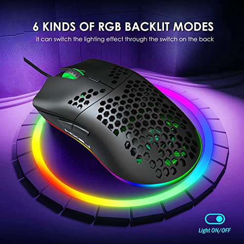 Wired Gaming Mouse, J900 6 RGB Lighting 6400 DPI Programmable USB Gaming Mice with 6 buttons, Honeycomb Shell Ergonomic Design for PC Gamers and Xbox and PS4 Users Black