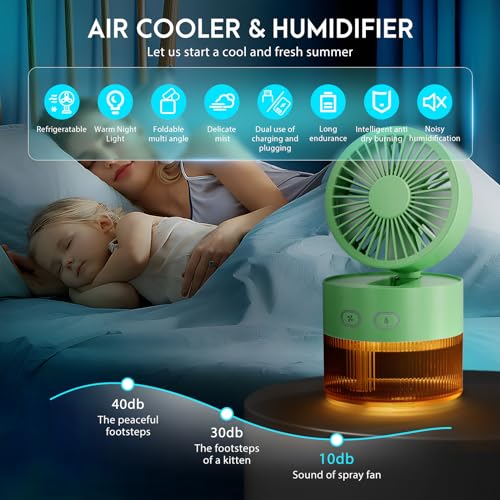 HuuppHip USB Desk Fan, 3 in 1 Portable Small Desktop with 3 Speeds, Night Light, Foldable Cold Air Humidification Spray Fan, Mini Table Cooling Fan for Home Travel Office Bedroom Outdoor