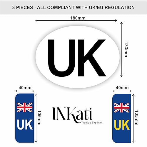 - Are you ready to hit the road in Europe with confidence? Look no further than the INKati UK Car Stickers 3-Pack! This essential set includes a prominent "UK" vehicle sticker, crafted to meet official EU/UK specifications (180x133mm), along with two perfectly sized UK number plate stickers for both the front and back of your vehicle. With these stickers, you'll be fully compliant and ready to explore the continent without any worries.