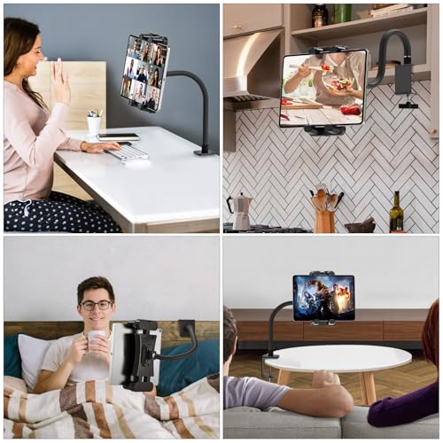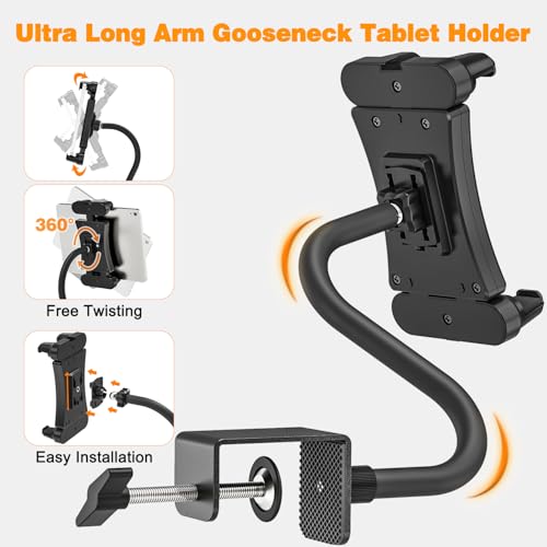 - Introducing the JUBORUI Tablet Holder Stand Desk, your ultimate solution for hands-free convenience! Designed with a robust carbon steel gooseneck arm and a secure aluminium clamp, this tablet holder easily attaches to desks, bed frames, or any flat surface, allowing you to effortlessly read, watch movies, or video call without straining your hands or neck. With its innovative 360° rotation feature, you can position your device in either portrait or landscape mode and adjust the angle to suit your viewing preference, ensuring optimal comfort during use.