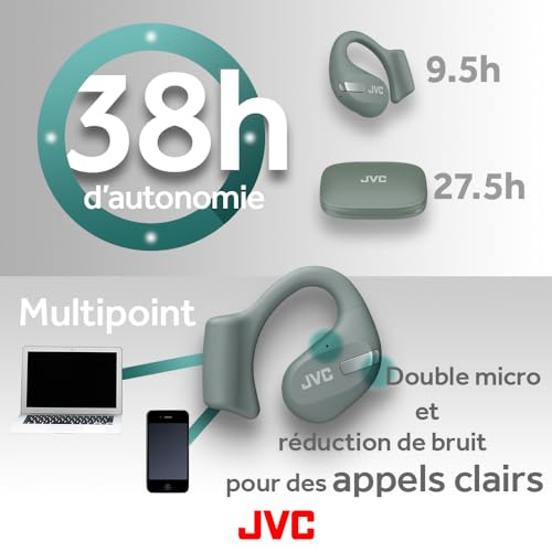 JVC Nearphones HA-NP50T-G, True Wireless Earbuds, Open Ear Design, Active Noise Reduction, Multi-Point, IPX4, Microphone Muting, 38 Hours Runtime, BT 5.3, (Sage Green)