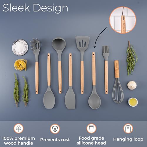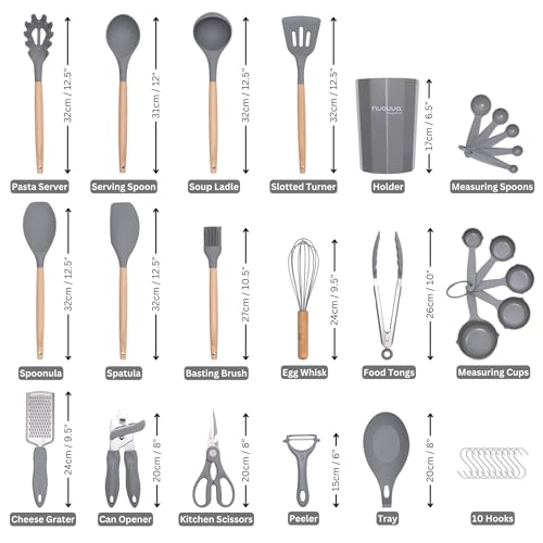 Kitchen Non Stick Cooking Utensils Set – Heat Resistant Silicone Utensils with Wooden Handle – Ladles, Spoons and Spatulas Set – Kitchen Tools & Accessories – 35pcs, Grey – by Nuovva