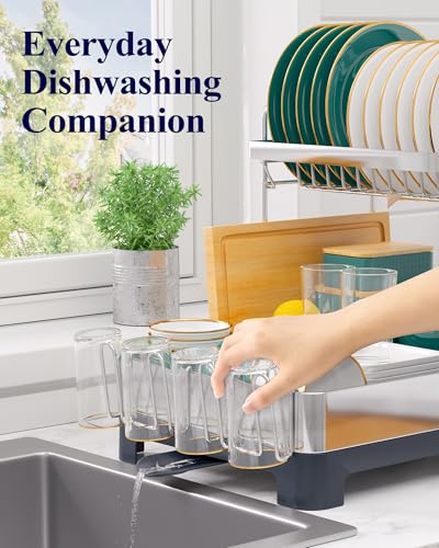 - Are you tired of cluttered countertops and soggy dishes? Meet the Kitsure 2-Tier Dish Drainer Rack, the ultimate solution for a tidy kitchen! Designed for households of 3 to 6 people, this spacious drying rack provides ample room for your plates, bowls, and mugs without monopolising your countertop. Its sleek, dark grey finish not only complements your kitchen décor but also enhances your space with its modern aesthetic.