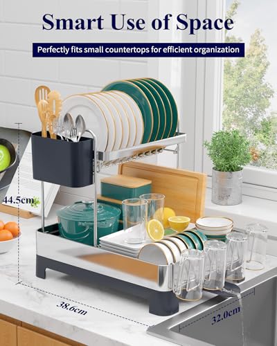 Kitsure Dish Drainer Rack - 2-Tier Rustproof Draining Board Rack with Utensil & Cup Holders, Space-Saving Drainer for Kitchen Countertop, 45.2 x 32.0 x 38.6 cm, Dark Grey