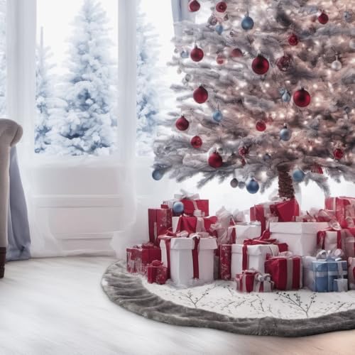 Lanpn 36" Christmas Tree Skirt, Large Plush Patchwork Silver Faux Fur Xmas Tree Skirts 90cm Tree Mat Base Cover for Winter Christmas Holiday Indoor Decorations (Silver, Branches)