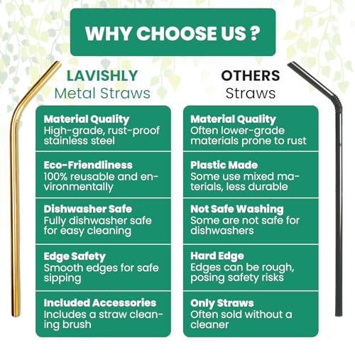 Made from food-grade stainless steel, Lavishly straws are BPA-free and rust-resistant, ensuring a safe and enjoyable experience with every sip. The set includes both straight and bent straws, catering to different preferences while providing versatility for all types of beverages—from refreshing smoothies to piping hot coffee.