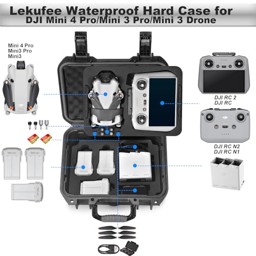 - Elevate your flying experience with the LEKUFEE Travel Waterproof Hard Case, meticulously designed for your DJI Mini 4 Pro and Mini 3 drones. This sleek and sturdy case offers unparalleled protection while ensuring convenience on the go. Crafted with custom EVA foam kits, this case securely accommodates your DJI Mini 4 Pro (including DJI RC 2), Mini 3, and all essential accessories, making it the perfect companion for adventure seekers and professionals alike.