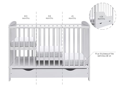 Safety is a top priority, and with three adjustable base positions, you can easily lower the mattress as your baby grows, making it easier to lift them in and out of the cot. The large covered drawer is perfect for keeping essentials organised, while the natural teething rails protect your baby during their explorations.