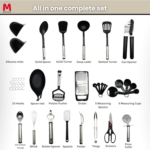 - This comprehensive set includes everything you need: a solid spoon, soup ladle, solid turner, slotted turner, whisk, potato masher, grater, kitchen scissors, spatula, peeler, pizza cutter, can opener, tongs, measuring spoons, a spoon holder, and mitts. Whether you're whipping up a quick meal or hosting a lavish dinner party, you'll find the right tool at your fingertips.