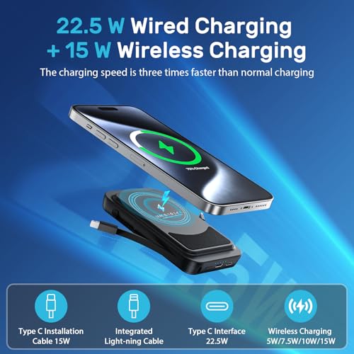 Plus, with its built-in cables and wireless charging feature, you can say goodbye to the clutter of multiple chargers. The strong magnetic attachment keeps everything secure, and the added safety features give you peace of mind while charging.