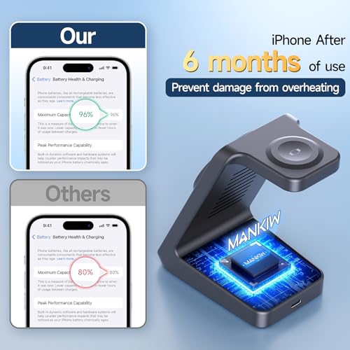 - Introducing the MANKIW 3 in 1 Wireless Charger for MagSafe, the ultimate charging solution designed for the modern Apple user. This innovative charging station not only provides fast and safe charging for your iPhone, iWatch, and AirPods but also keeps your workspace tidy and organised. With its cutting-edge magnetic technology, you'll experience a stable and efficient wireless charging experience, allowing you to rotate your iPhone 360° for optimal positioning.