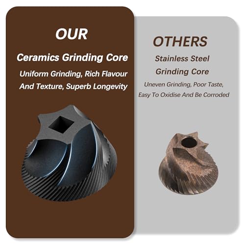 The professional-grade ceramic grinding mechanism is a game changer, protecting the integrity of flavour while delivering a consistently smooth grind. With the adjustable coarseness feature, you can effortlessly switch from fine grounds for espresso to coarser textures for French press – all without the need for batteries!