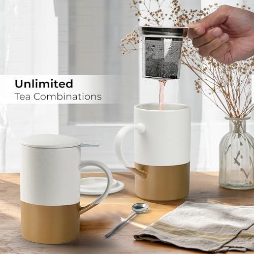 MIAMIO - Tea Cup Set 2 x 500 ml with Infuser and Lid/Ceramic Tea Mug with Infuser and Spoon for Steeping Loose Leaf Tea, Gifts for Tea Lovers - Microwave & Dishwasher Safe (Brown)