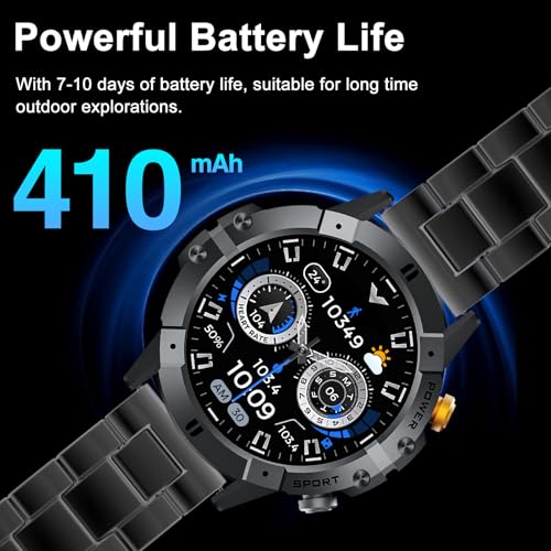 - Boasting a powerful 410mAh battery, enjoy 7-10 days of usage on a single charge, ensuring that your smartwatch is always ready for action. With both silicone and metal strap options included, you can easily switch styles to suit any occasion. Discover the ultimate blend of functionality and style with the AMZSA Military Smart Watch – your perfect fitness partner awaits!