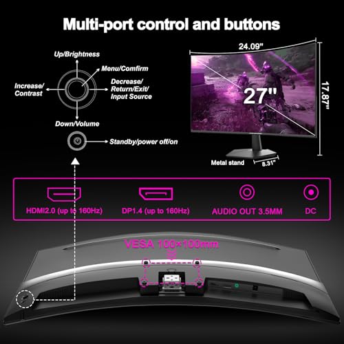 Minifire 27 Inch Gaming Monitor, 160Hz, Curved Gaming Monitor, 1500R, 1Ms, sRGB130%, FHD 1080P Computer Screen, VESA Compatible, Eye Care Adaptive Sync HDMI&DP Prots (MFG27C1L )