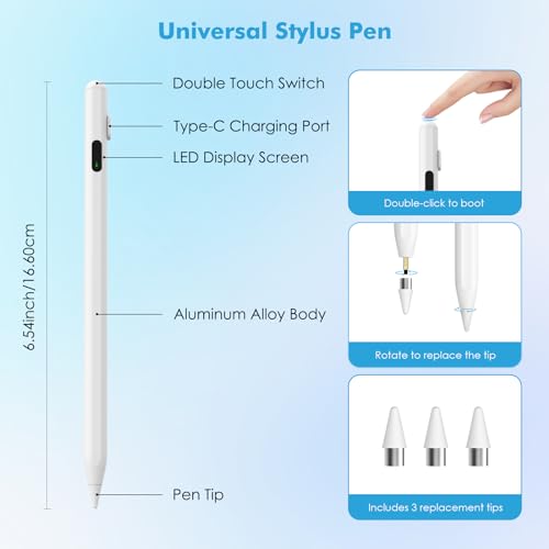 MoKo Stylus Pen for Touch Screen, Active Universal Stylus Pen Compatible with iPad/iPhone/Samsung (Non-S Pen) and Other iOS/Android Smartphone and Tablet Devices Tablet Pen with Power Display, White