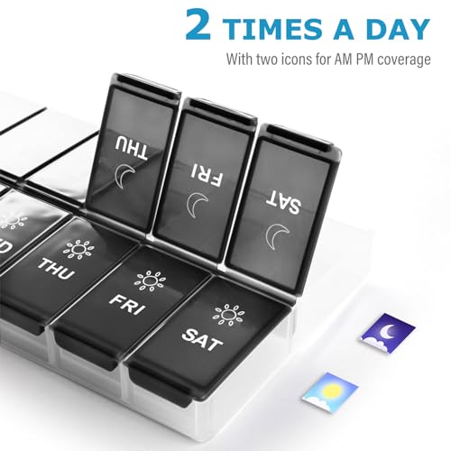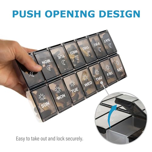 This innovative pill organiser is more than just a storage solution; it's a commitment to your well-being. With its extra-large capacity, you can fit an impressive number of vitamins and supplements, tailored to your unique health needs. The thoughtfully designed 7-day layout ensures that you can easily track your morning and evening doses, eliminating the guesswork and anxiety that often accompany medication schedules.