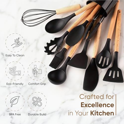 MYOTTPRO Silicone Kitchen Utensils Set, 12 Pcs Cooking Utensil Pack for Nonstick Cookware with Wooden Handles, Heat Resistant Silicone Coated Cooking Tools with Turner Tongs Spatula Slotted Spoon