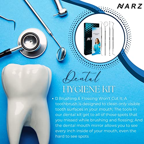 - Introducing the NARZ Plaque Remover for Teeth Cleaning—a premium dental care kit designed to elevate your oral hygiene routine! Crafted from high-quality, surgical-grade rust-free stainless steel, this 4-piece tool set is not only durable but also stylish. Each tool is thoughtfully designed to assist you in achieving a radiant smile and fresh breath, making it an essential addition to your dental arsenal alongside your favourite teeth whitening products and stain erasers. This comprehensive dental hygiene kit includes a Dental Probe, Dental Scaler, Mouth Mirror, and Tartar Scraper. These professional-grade tools are perfect for tackling plaque and tartar, allowing you to clean those tricky spots often missed during daily brushing and flossing. The Dental Mirror aids in spotting debris, while the Tweezers help efficiently remove food particles lodged between your teeth. Imagine confidently smiling, knowing that your teeth are spotless and your breath is fresh! Not only is this kit ideal for personal use, but it also doubles as an excellent tool for maintaining your pets' dental health. Spend quality time with your furry friends while ensuring their teeth are clean and refreshed. Packaged in a durable zipper case, the NARZ Plaque Remover is perfect for travel, ensuring that your dental tools stay organised and hygienic wherever you go. Invest in your oral health today and experience the difference with NARZ!