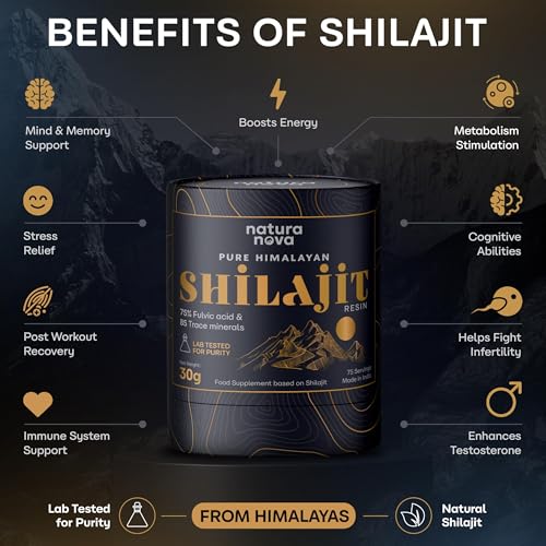 - Discover the incredible power of NaturaNova Pure Himalayan Shilajit Resin, a 100% natural supplement designed to elevate your health and vitality. Sourced from the pristine heights of the Himalayas, where golden-brown rocks lie over 17,000 feet above sea level, our shilajit is rich in over 85 trace minerals and boasts an impressive fulvic acid content of 75%. This unique composition makes it a powerhouse for energy restoration, immune support, and overall wellness.